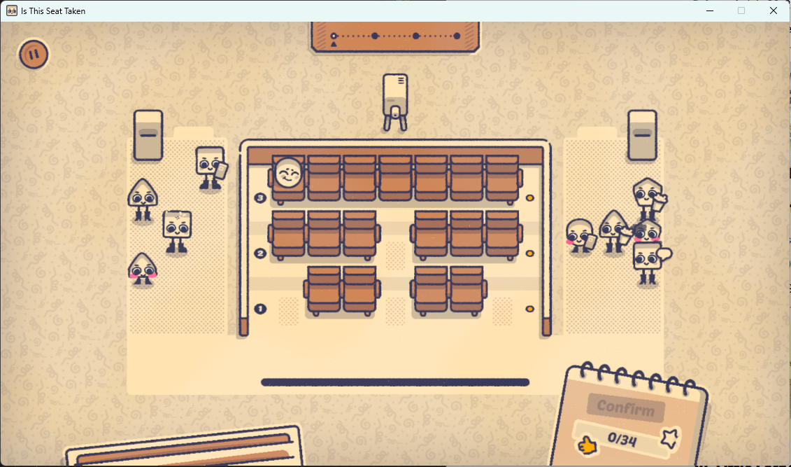 It's shapes with faces, arms, and legs. Is This Seat Taken is a logic puzzle game for all ages, all about placing cute shapes in spaces depending on their requirements. Adorable hand drawn visuals, funny dialogue, and adorably interactive props make this game stand out.