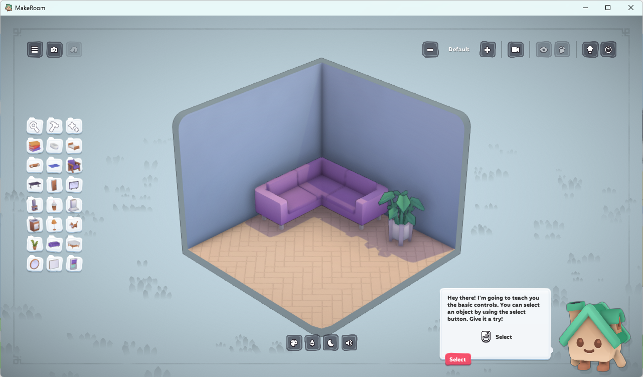 Decorate diorama-style rooms, campervans, gardens, and boats with cute low-poly furniture, pets, and particle effects. The mascot of the game is a little house with a green roof, with arms, legs, and a face. The music, gameplay, and visuals "MakeRoom" the perfect interior designer for all ages.